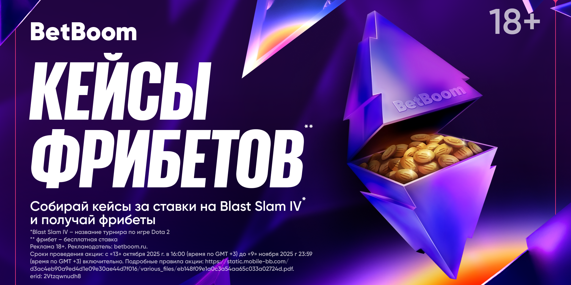 Букмекерская компания BetBoom объявила о запуске специальной акции «Кейсы фрибетов» в честь BLAST Slam IV² по Dota 2. Она проходит с 13 октября ...