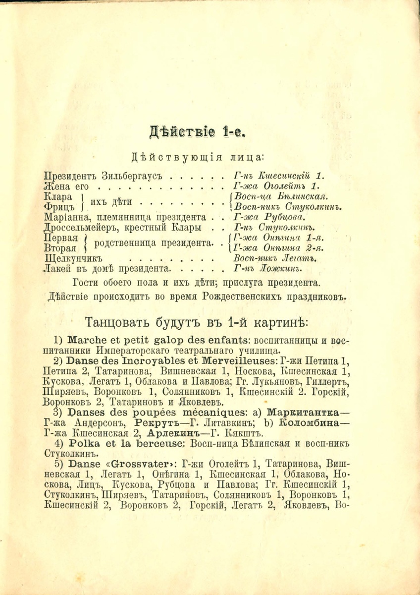 Особенное возмущение у всех вызывали исполнители главных ролей, которые были еще студентами балетного отделения Петербургского театрального училища. Партию Мари исполнила Станислава Белинская, а Щелкунчика — Сергей Легат. Легату было 17 лет, а Белинской — всего 12. Критики живо интересовались, когда на сцену выведут пятилеток.