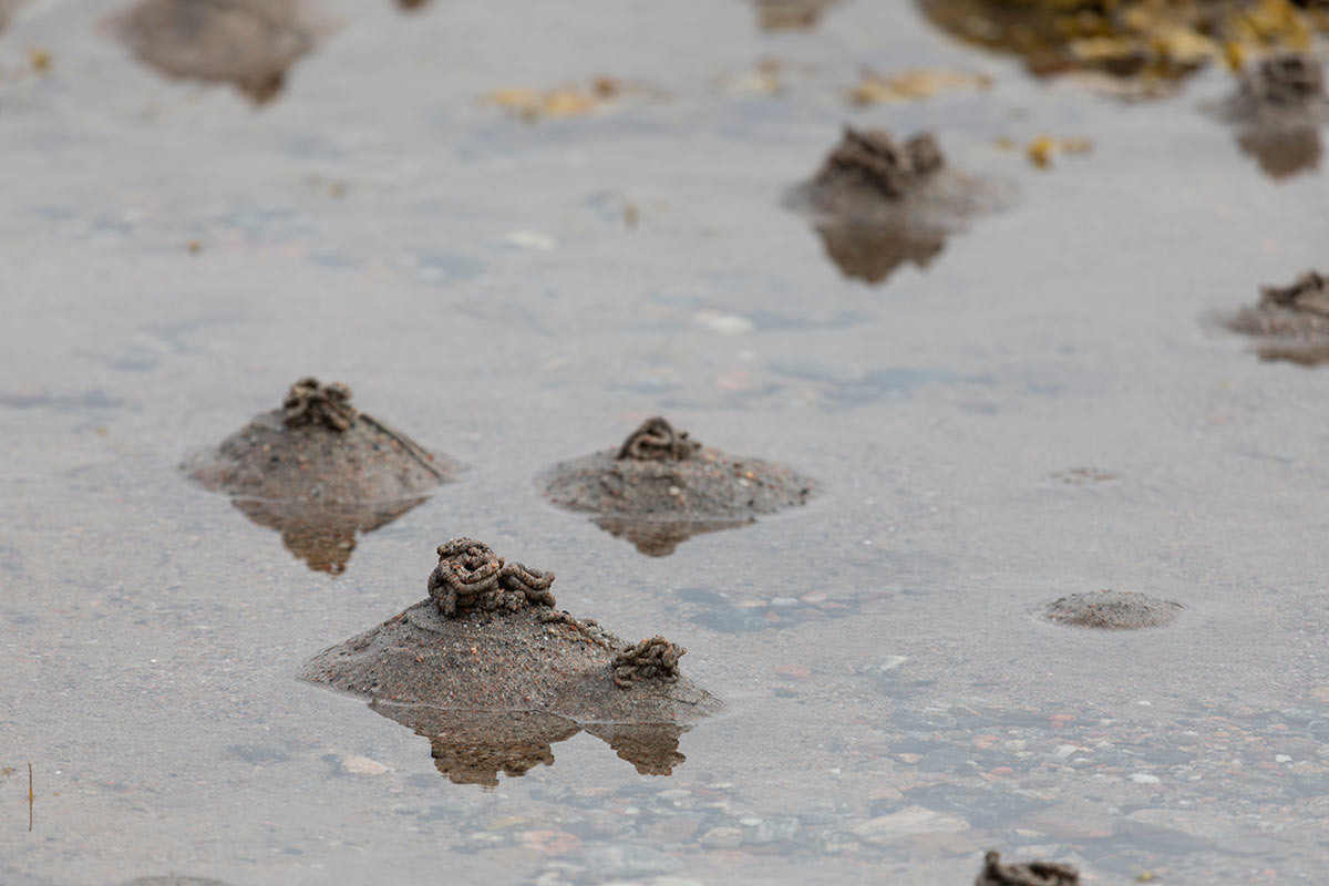 Один их наиболее многочисленных обитателей средней литорали - многощетинковый червь пескожил. На литорали повсюду можно увидеть следы его жизнедеятельности: конические кучки песка и небольшие ямки. Сам пескожил сидит в норке, а над его ртом на поверхности образуется воронка, потому что он все время заглатывает песок с разлагающимися органическими веществами, служащими ему пищей. Пропустив грунт через кишечник, пескожил выбрасывает его наружу. На этом месте появляется конусовидная кучка с тонкими шнурами из слипшегося песка.