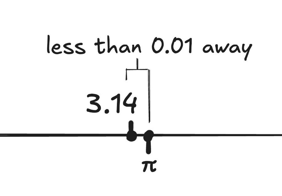 Конструктивные вещественные числа — это числа, которые вы можете вычислять всё точнее и точнее. Вы никогда не сможете назвать мне все десятичные дроби числа π. Но если я попрошу вас назвать рациональное число в пределах 0,01 от числа π, вы можете назвать мне 3,14. Число π находится в пределах 0,01 от числа 3,14, так что это правильный ответ.