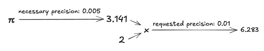 Теперь предположим, что я прошу вас найти число в пределах 0,01 от 2π. Вы знаете, как вычислить цифры числа π. (3,14159...) Затем вы можете взять некоторые из них и умножить на 2. Но сколько цифр вам нужно взять, чтобы ваш ответ был в пределах 0,01 от 2π?
