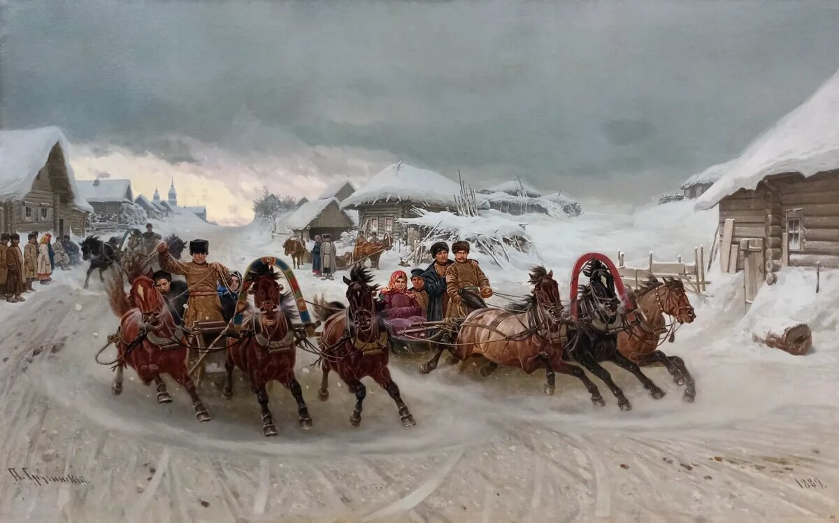 Это одна из самых известных жанровых картин Петра Николаевича Грузинского (1837 – 1892), наполненная лихой удалью и азартом праздничных русских катаний на тройках. В то же время в ней преобладают серые, коричневые и белые оттенки, что создает ощущение суровой русской зимы. Грозное небо, снежные заносы, лошади, выбивающие снег из-под копыт, – все говорит о стихийной мощи природы.