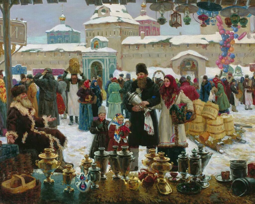 В ярмарочных рядах оживленно торгуют различными товарами: от изделий ручной работы до традиционных угощений. В центре картины — широкий прилавок с самоварами, чайниками и чашками, в которых отражается зимний свет. Насыщенные теплые цвета: красные платки, разноцветные одежды, отливающие позолотой самовары, синие узоры на фарфоре, — придают этой сцене живописность и праздничность. Фон же выполнен в приглушенных зимних тонах, что усиливает контраст между холодным снегом и теплом человеческого общения.